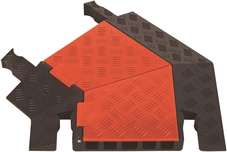 Checkers Guard Dog Medium-Profile Cable Protectors offer maximum grip and stability, preventing slips in heavy-duty environments. The patented 5-bar tread surface ensures superior traction. This cable protector is designed for quick cable placement and removal, enabling fast setup for events like trade shows or other public areas. Created from durable, non-toxic, weather-resistant polyurethane, these protectors provide protection for cables and hoses up to 1.25 inches in diameter. They are 75% lighter and 5 times stronger than toxic rubber alternatives, making them an ideal choice for demanding conditions. These cable protectors are designed to be lightweight while still supporting heavy equipment and vehicle traffic. They provide safe passage for people, vehicles, and equipment while protecting cables and hoses. The modular interlocking system with Dog-Bone® Connectors allows for easy extension and secure linking to fit any setup. Available with ADA-compliant cable ramp and hose ramp options, these heavy-duty cord covers ensure safe and accessible access for all pedestrians. Checkers Guard Dog Medium-Profile Cable Protectors also include turn pieces, end caps, and crosses, providing versatile solutions to accommodate complex cable layouts and ensure seamless coverage for any setup. Proudly made in the USA, Checkers, a part of Justrite Safety Group, leads the way in cable protection solutions.