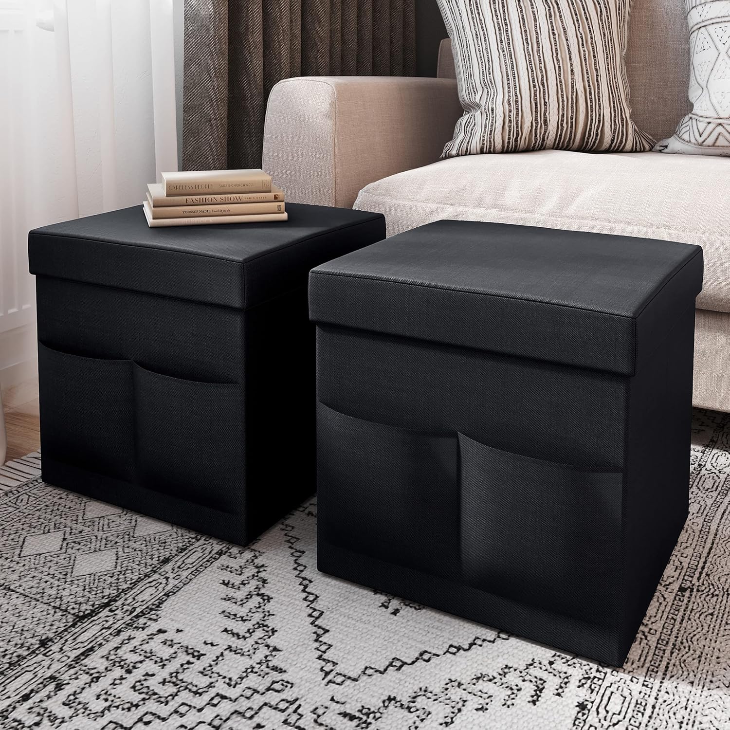 Bring the best of style and function to your home with the Ottoman with Storage for Living Room Set of 2 by Lavish Home. Each small ottoman features clean modern lines, a premium linen-look polyester outer cover that is easy to clean with a damp cloth, and ample foam padding for seating comfort. This storage ottoman cube set is constructed from sturdy MDF materials to give each one a 330-pound weight capacity as a seat and 30-pound capacity as a storage piece. The collapsible design makes them easy to set up in seconds, and they can be folded flat when not in use for compact storage. This square ottoman set is an excellent option for organizing your living room, family room, dorm, RV, or apartment. IMPORTANT: Lavish Home is committed to providing the consumer with the absolute best price and value on all of our products. NOTE: This is an exclusive product of Lavish Home and ONLY Ottomans for Living Room by Lavish Home are GUARANTEED to be genuine. Avoid buying counterfeit products and transacting with unauthorized sellers.