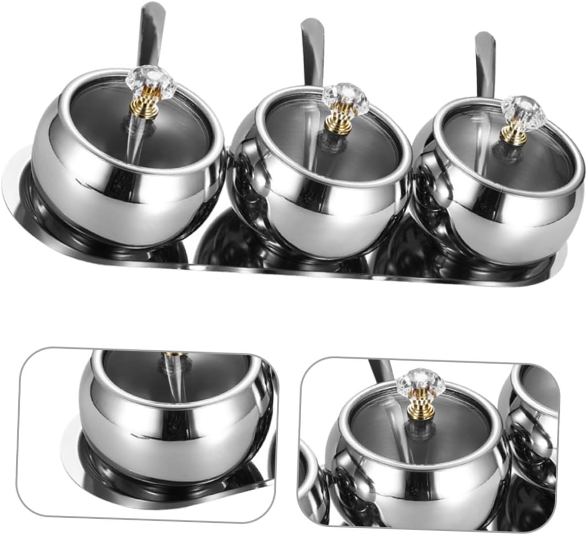 Package Include 3 Sets x Seasoning Jars with Lid and Spoon 1 x Organizer Tray Characteristics -Material:Stainless steel -Easy organization: the accompanying tray catches any spills, keeping your kitchen surfaces tidy and making cleanup quick and effortless pepper jar - construction: crafted from stainless steel, this jar is resistant to tear and wear, ensuring longtime use and maintaining its polished look over time stainless steel condiment jar -Timeless design: the combination of functionality and elegance makes this jar a timeless piece that complements any kitchen decor kitchen spice storage jars - Color: Silver - Size: 31.50X10.00X9.00cm/12.38X3.93X3.54in -Wide application: suitable for storing a range of ingredients, from sugar and salt to coffee and spices, making it a versatile addition to your kitchen tools sugar bowls with spoons -Product Info: Stainless steel seasoning jars -Fresh keeper: the airtight lid design locks in freshness, keeping your seasonings flavorful condiment jarsGoods Informationkitchen spice boxes The accompanying tray adds a touch of sophistication, making it a practical and stylish choice for any kitchen.seasoning container bottles This elegant stainless steel seasoning container set is designed to keep your kitchen organized and your condiments fresh.condiment holder with lid The sugar bowl with lid and spoon is suitable for storing salt, coffee, or sugar