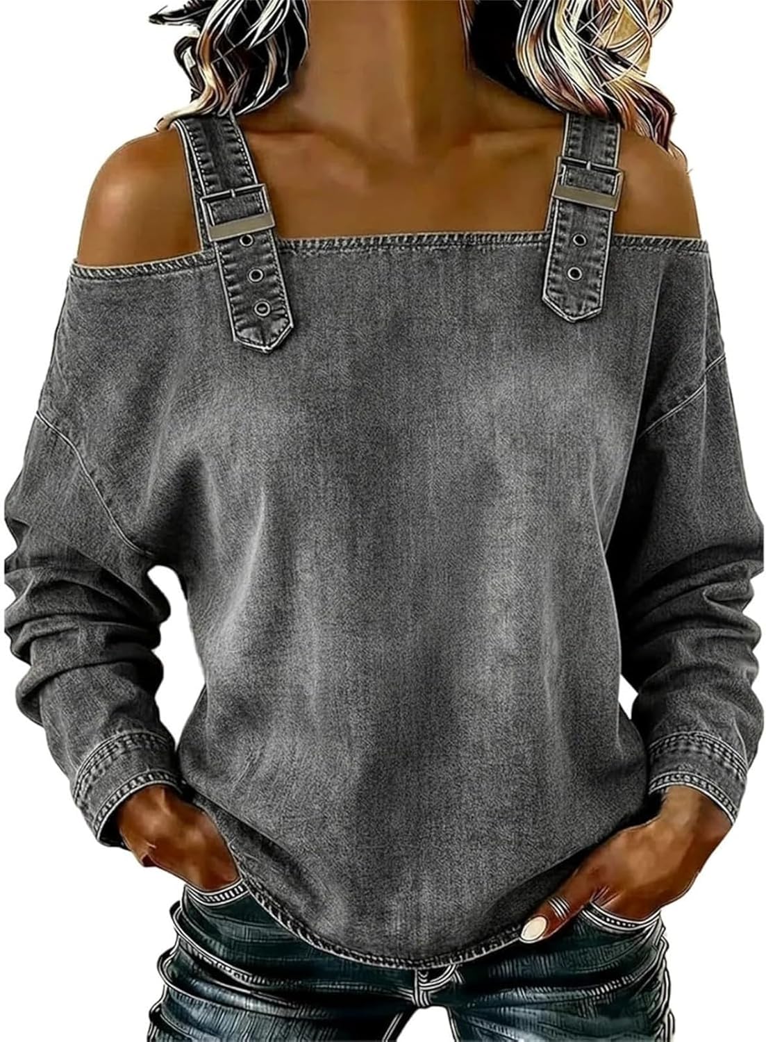 Women's Off The Shoulder Tops Adjustable Straps Cowboy Shirt Long Sleeve Sexy Casual Buckle Strap Denim Tops